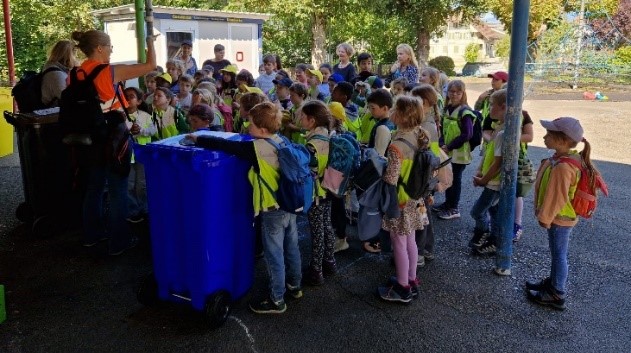Zurück beim Schulhaus ging es an die nächste wichtige Aufgabe: den Abfall sortieren. Mit grossem Eifer trennten die Kinder Glas, Papier und Karton, Aluminium, PET, Batterien und Restmüll. So konnten wir zeigen, dass Abfall nicht einfach „weg“ ist, sondern in vielen Fällen wiederverwertet werden kann.