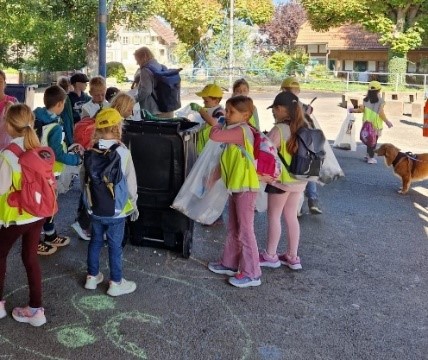 Zurück beim Schulhaus ging es an die nächste wichtige Aufgabe: den Abfall sortieren. Mit grossem Eifer trennten die Kinder Glas, Papier und Karton, Aluminium, PET, Batterien und Restmüll. So konnten wir zeigen, dass Abfall nicht einfach „weg“ ist, sondern in vielen Fällen wiederverwertet werden kann.