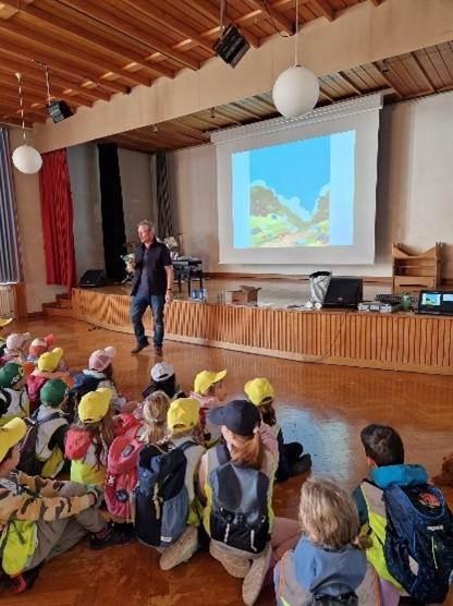 Gestartet haben wir gemeinsam in der Aula. Dort begrüsste uns Herr Marc Gast, Leiter Entsorgung der Firma Gast in Utzenstorf. Er erzählte uns einige interessante Informationen rund ums Thema Littering und Entsorgung. Mit spannenden Beispielen erklärte er uns, wie lange es dauert, bis Abfall in der Natur abgebaut wird. Wussten Sie, dass ein Plastiksäckli ganze 450 Jahre braucht, bis es verschwunden ist? Selbst eine Bananenschale bleibt noch 1–2 Jahre liegen. Die Kinder staunten, hörten aufmerksam zu und stellten viele neugierige Fragen.